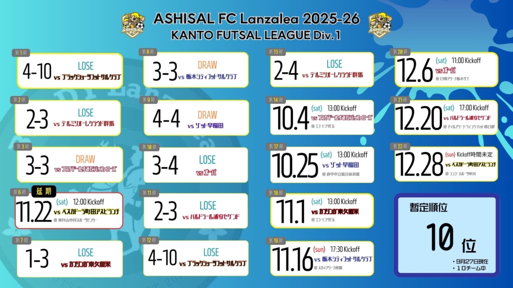 【終了】関東フットサルリーグ1部 第14節 開催日:10月4日(土)